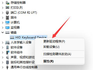 3、在其中找到我们的键盘设备,右键选中它,点击“更新驱动程序”