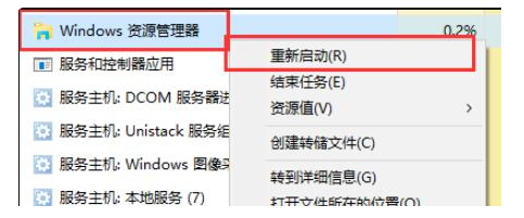 7、最后打开我们的任务管理器,找到其中的“资源管理器”,右键选择“重新启动”即可。