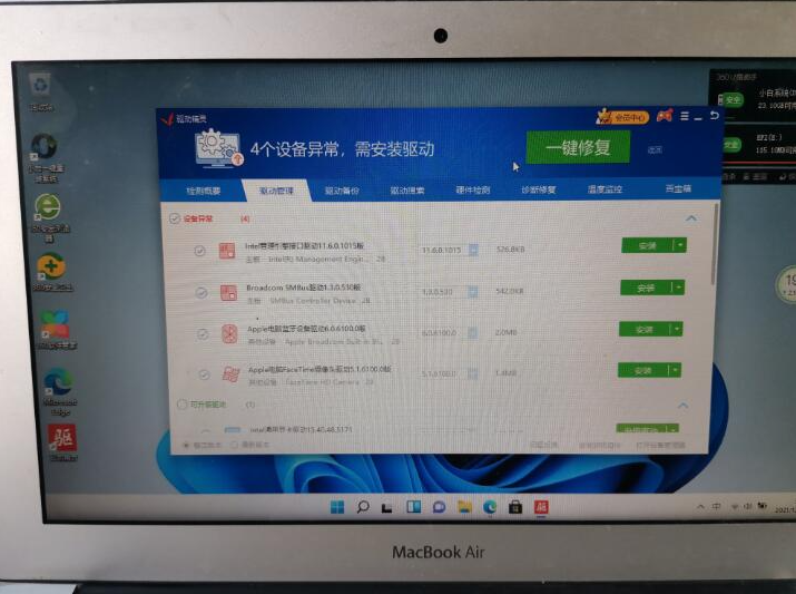 1、正常进入到Win11系统后可能电脑可能无法联网,这个时候插上U盘,把下载备用的驱动精灵网卡版和驱动人生网卡版以及苹果 Windows 驱动包拷贝到电脑中。安装驱动精灵网卡版更新驱动,然后正常联网并更新相关驱动。