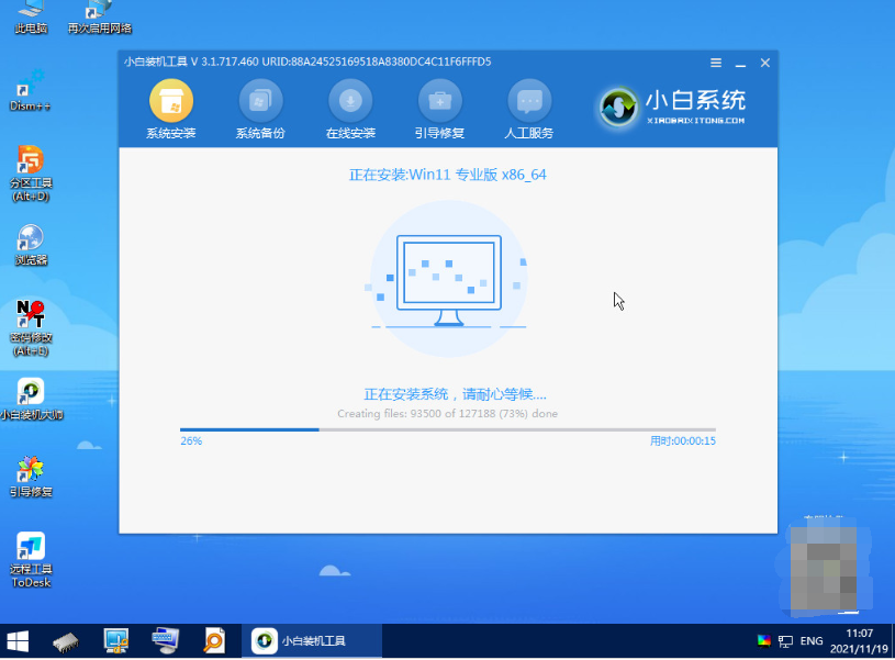 5、进入pe系统后,小白装机工具开启并安装win111系统,无需操作。