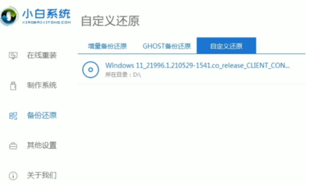 2.然后打开小白一键重装系统,点击备份还原,然后选择自定义还原扫描我们下载的win11系统。